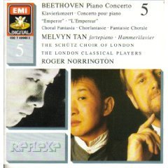 这张唱片上也有《皇帝协奏曲》,而且与搭配的《合唱幻想曲》一同被“企鹅指南”评鉴为三星带花的演录。这是个堪称全新的诠释,“新”到令我难以完全接受它。以仿古钢琴和仿古乐队的如此空灵、朦胧的音响意境来表现贝多芬,也是前人无法想象的。当然,诺灵顿这个乐团比霍格伍德的更为著名的仿古乐团音色上多些暖意,管乐部分尤为精彩。新加坡华裔谭梅文如今已是年轻一代钢琴家中颇具个性的一位,总是弹着一架1814年造的fortepiano,音粒扁而短促,却有一种朦胧的温馨。他和诺灵顿合作,在EMI用三张唱片灌录了全套贝多芬协奏曲(另外两张编号分别是:7 49509 2 和 7 49815 2),全都是这般演绎,相当新颖、迷人。你如果已经有了贝多芬钢琴协奏曲的比较端庄、正统的版本,倒是不妨再听听谭梅文和诺灵顿的这些,也是长了见识。