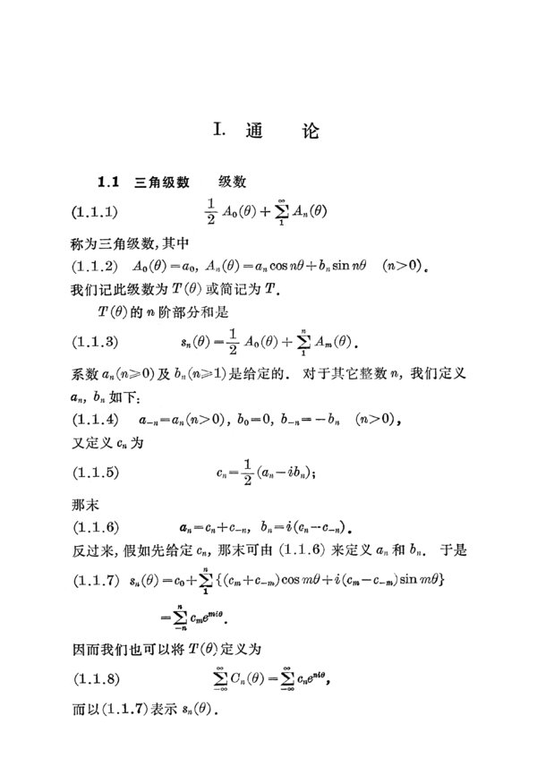 : 序言 第I章 通论 1.1 三角级数 1.2 三角级数与调和函数 1.3 Fourier三角级数 1.4 测度和积分 1.5 L^p类 1.6 L^p空间及其度量 1.7 L^p中的收敛 (强收敛) 1.8 两个周期函数的折合 1.9 L^2中的直交系 1.10 直交系的例子 1.11 一些进一步的知识 第II章 Hilbert空间中的Fourier级数 2.1 L^2中一般的Fourier级数 2.2 Riesz-Fischer定理 2.3 完备系和Parseval定理 2.4 Mercer定理 2.5 封闭性和完备性 2.6 三角函数系的完备性 2.7 三角级数的Parseval定理和Riesz-Fischer定理 2.8 关于其它函数系的一些定理 2.9 Weierstrass定理 第III章 Fourier三角级数的其它性质 3.1 Fourier常数的简单性质 3.2 Riemann-Lebesgue定理 3.3 几个简单不等式 3.4 Fourier常数的数量级 3.5 有界变差函数 3.6 几个基本公式 3.7 —个特殊的三角级数 3.8 Fourier级数的积分 3.9 —个基本的收敛定理 3.10 具有递降系数的级数 3.11 具有递降系数的级数 (续) 3.12 Gibbs现象 第IV章 Fourier级数的收敛性 4.1 引言 4.2 Fourier级数的收敛问题46 4.3 在一点的连续条件 4.4 Dini判别法 4.5 有界变差函数: Jordan判别法 4.6 Lebesgue判别法 4.7 —致收敛的其它判别法 4.8 共轭级数 4.9 共轭级数的收敛问题 4.10 共轭级数的收敛判别法 4.11 s_n (θ)和s ̃_n (θ)的数量级 4.12 在连续点的发散性 4.13 就范直交系的Lebesgue函数 4.14 三角函数系 (T) 的Lebesgue常数 第V章 Fourier级数的求和 5.1 引言 5.2 线性的正则求和法 5.3 (C, l) 求和法以及A-求和法 5.4 K-求和法及其核 5.5 Fourier级数在连续点或跳跃点的求和 5.6 几乎处处可求和 5.7 Fourier级数的 (C, 1) 求和 5.8 共轭级数的 (C, 1) 求和 5.9 A求和 5.10 共轭级数的A求和 5.11 定理70至76的一些应用 5.12 Fourier级数的导级数 第VI章 第V章定理的应用 6.1 引言 6.2 —个几乎处处发散的Fourier级数 6.3 具有正系数的Fourier级数 6.4 Kolmogoroff的另一定理 6.5 Fourier级数的强性求和 6.6 其它求和法 6.7 应用 6.8 共轭函数的存在性 6.9 Fourier级数的收敛因子 6.10 Kuttner定理 第VII章 一般三角级数 7.1 通论 7.2 收敛的三角级数的系数 7.3 Riemann求和法 7.4 连续函数的广义二阶导数 7.5 关于凸函数的一个定理 7.6 Cantor定理和 du Bois-Reymond定理 7.7 无界函数. de la Vailée-Poussin定理 7.8 更一般的情形 附录