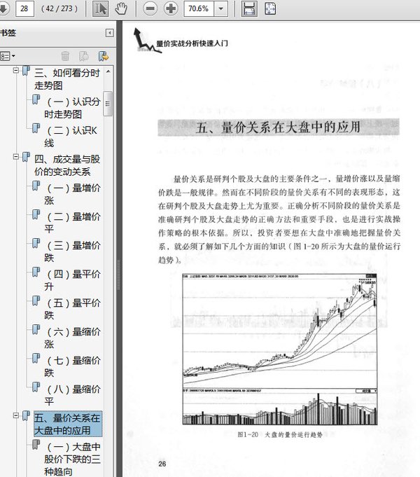 : 第一章 量价关系基本知识 一、什么是成交量 2 (一)成交量的表达方式 2 (二)成交量的变化形态 4 二、什么是股价 7 (一)股票的理论价格 7 (二)股票的市场价格 8 三、如何看分时走势图 9 (一)认识分时走势图 9 (二)认识K线 11 四、成交量与股价的变动关系 17 (一)量增价涨 17 (二)量增价平 18 (三)量增价跌 20 (四)量平价升 20 (五)量平价跌 21 (六)量缩价涨 22 (七)量缩价跌 23 (八)量缩价平 25 五、量价关系在大盘中的应用 26 (一)大盘中股价下跌的三种趋向 27 (二)大盘中进货的信号特征 27 (三)大盘中趋势反转的两种情况 27 (四)大盘中的“量实价虚”之说 28 (五)大盘中时间所起的重要作用 28 (六)大盘中的其他趋向走势 28 六、涨跌停板下的量价关系 29 (一)涨跌停板下量价关系的判断标准 30 (二)一般情况下与涨跌停板下量价关系的对比 31 七、成交量认识上的误区 32 (一)本末倒置量价之间的关系 32 (二)只对某一时点的成交量进行分析 33 (三)只用成交量来进行大盘分析 33 (四)片面认为只要股价上涨就要放量 34 (五)简单地认为下跌过程中只要量缩就会止跌 34 (六)草率地认为突破平台时一定会放量 35 本章操作提示 36 .........