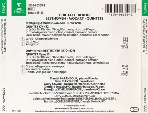 Beethoven and Mozart, Quintets, Daniel Barenboim, piano; Dale Clevenger, horn; Larry Combs, clarinet; Daniele Damiano, bassoon; Hansjorg Schellenberger, oboe