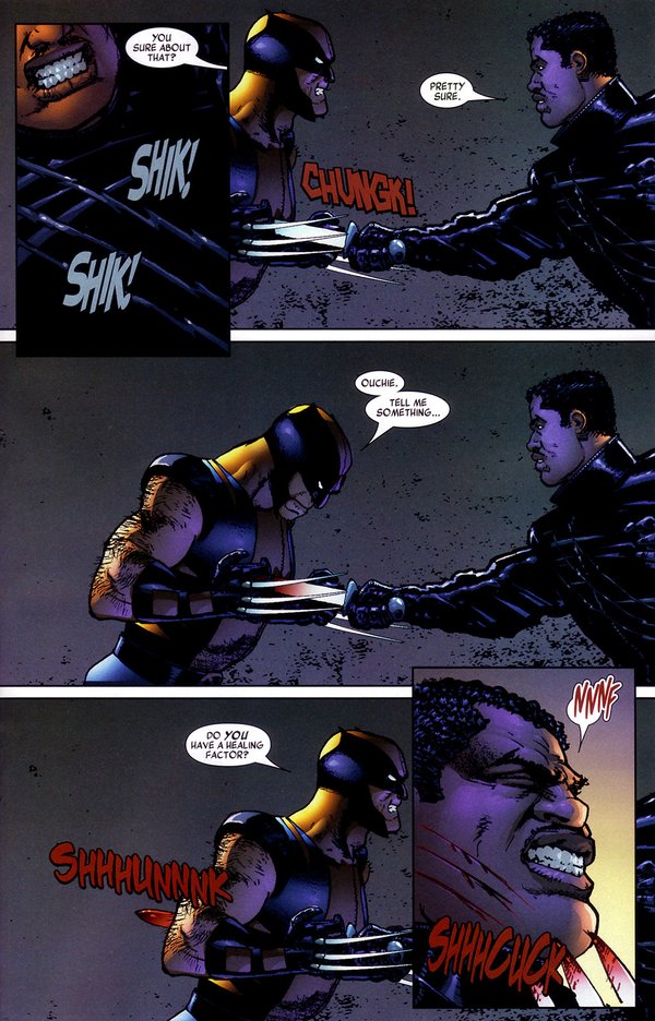 金刚狼在内战故事里面被S.H.I.E.L.D.抓了起来,然后自己逃走了,S.H.I.E.L.D.立刻派Blade去追捕。