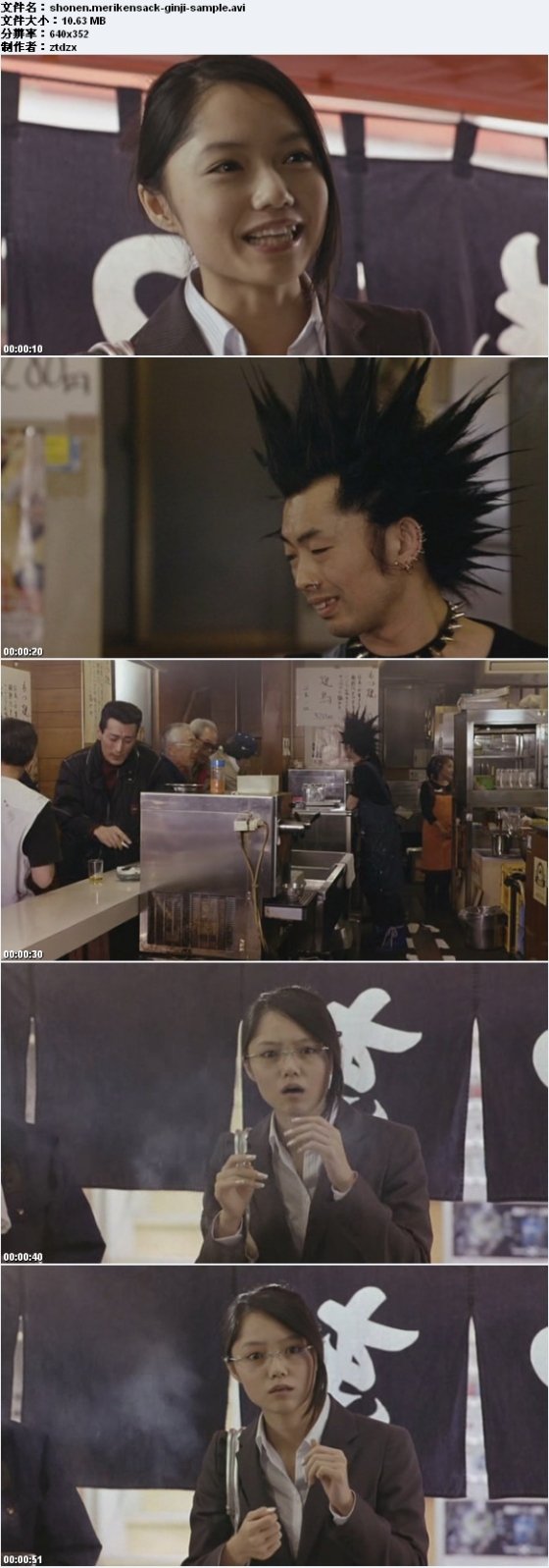 神奈是唱片公司新人挖掘部的年轻粉领,进公司两年来毫无建树,如今合同马上就要到期,如果再出不了成绩就会被炒鱿鱼。   正当紧急关头,千载难逢的机会突然从天而降。神奈在互联网上偶然看到了一段视频,那是朋克乐队“少年手指虎”的现场演唱会片段。这几个风格狂野的帅哥让神奈眼睛一亮,决定让他们成为公司的签约艺人,拯救自己的职业生涯。神奈跑去找他们交涉,不料眼前出现的竟是烂醉如泥的半百大叔——原来网上的饰品是二十五年前的旧物。   然而,令神奈大为惊讶的是,这个大叔朋克乐队竟然在网上人气飙升,可以收看他们表演视频的网站由于访问量过大几近瘫痪。唱片公司决定力捧这个乐队,社长给神奈布置了一项任务——举行“少年手指虎”全国巡回演唱会。虽然明知这个决定过于仓促冒险,但为了保住自己的饭碗,神奈只得接下了烫手的热山芋。   半裸莫希干人装束、剃眉加穿刺、我行我素性格乖张的朋克大叔们和神奈一起坐上小面包车,开始了前途未卜的全国之旅…… 幕后制作   官九郎再执导筒   宫藤官九郎可谓日本演艺圈中的怪才。从大学退学后,宫藤进入了先锋剧团“大人计划”,凭借能编会演的才华很快崭露头角,成为核心成员之一。不久后,他又接手编创电视综艺节目,展露出多方面的天赋。2002年,宫藤凭借电影《GO!大暴走》一举摘得日本学院奖的最佳剧本桂冠。同时,电视连续剧创作方面的实绩又令宫藤知名度节节攀升,逐渐成为广为人知的名编剧,不少热门剧集,如《木更津猫眼怪盗团》系列、《龙与虎》等,都出自宫藤的笔下。   宫藤官九郎似乎有着冒不完的奇思妙想,他的台词幽默而贴近生活、他的情节构架新潮独特,别具一格的风格引来了不少人的追捧。并不满足现状的宫藤不断向新的领域“扩张”。05年,他执导了首部电影《真夜中的弥次先生喜多先生》。和同样“编而优则导”的三谷幸喜不同,宫藤并没有走大众娱乐路线,而是在这部处女作里把自己的想象力和怪诞之能发挥得淋漓尽致。如今时隔三年多,宫藤又为我们带来了自编自导的新片《少年手指虎》。   这是一个关于大叔朋克乐队和唱片公司嫩芽小白领全国巡回的故事,颇有些公路电影的味道。让大叔乐队作主人公是本片构思的出发点。宫藤最初设想让几个中年人出于某个契机时隔数十年重组乐队,但由于没多少钱,只能挤在一辆小车中去各地开演唱会。宫藤回忆创作契机时这样说道:“如果让二十来岁的年轻人作主角,因为他们拥有未来,所以再艰苦的巡回之旅也能撑下去。因此我想换成没有梦想也没有未来的大叔们来编织故事。”其实这样的考虑不仅出于情节需要,也是宫藤企图突破局限、展现自己想法的手段。纵观影坛,讲述年轻人组乐队的电影并不少见。但宫藤认为音乐并非年轻人的专利,他有意不去聚焦乐手或酷或帅光鲜亮眼的地方,反而择取特殊的视角,展现出音乐之路与人生成长的不易。   宫藤自己也玩乐队,他和“大人计划”另两位成员村杉蝉之介、阿部隆史一道组成了“GROUP魂”,该乐队曾经受邀参加过红白歌会。宫藤自称是个朋克迷,他透露:在最百无聊赖的初中时代,朋克乐被引入日本,这种音乐形式一下子充实了他的生活。这部影片洋溢着宫藤对朋克的热爱,表现出他的率真和个性。如果你看了没有半点触动,那么只能遗憾地说,你和宫藤官九郎合不来。   宫崎葵脱线暴走   “少年手指虎”乐队成员的扮演者佐藤浩市、木村佑一、三宅弘城、田口智朗皆为经验丰富的个性派演员,加上奇装异服的打扮、夸张狂野的舞台表演,自然会不乏充满新鲜感的看点。   值得注目的是,影片还邀得目前红得发紫的宫崎葵出任女主角。多以清纯可人形象出现的宫崎将在片中发挥颠覆性的搞笑演技,令人耳目一新。而她和大叔们充满对比性的互动更是令影片的喜剧效果成倍增长。   宫藤导演表示,宫崎葵是他特别喜欢的女演员,一直希望有机会能与之共事。挖掘乐队的女主人公设定为年轻女孩后,宫藤希望这个角色的形象最好离朋克世界很远,越没有朋克感越好,于是便想到了宫崎这个想到合适的人选。   当宫崎葵接到片约时,正忙着拍摄大河剧《笃姬》,但一听说是宫藤的作品,便欣然接受了片约。“宫藤先生创造的世界观非常有意思,观众肯定会笑。所以听说这件事后,我决定无论如何也要出演。”宫崎的加盟令宫藤导演欣喜非常。而宫崎本人得以接触朋克、施展难得的脱线演技,以也“玩”得十分开心。她利用《笃姬》的制作间隙赶场拍摄本片,虽说辛苦,但只要到了本片的拍摄现场必是笑声不断,让她简直不想离开。 花絮    在出演本片前,宫崎葵完全不了解朋克乐。 代码 ________.__ _______ ____.__ / _____/|__|\ \ | |__| / \ ___| |/ | \ | | | \ \_\ \ / | \/\__| | | \______ /__\____|__ /\________|__| \/ ginjigroup@gmail.com The Shonen Merikensack (2008) Supplier .........: Team GiNJi DivX Rls Date ....: 2009/08/11 DVD Rls Date .....: 2009/08/07 Theatre Date .....: 2008/10/19 Video Format .....: XviD Video Bitrate ....: 1162 Kbps Resolution .......: 640 x 352 Aspect Ratio .....: 1.82 : 1 Language .........: Japanese Audio Format .....: AC3 6CH Audio Bitrate ....: 384 Kbps DVD Runtime ......: 125 Min Frame Rate .......: 23.976 FPS Subtitle .........: Japanese Film Genre .......: Comedy File Size ........: 2 X 49 x 15MB IMDB URL .........: http://www.imdb.com/title/tt1313146/ DVD Link .........: http:/