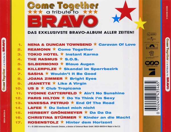 : 01. Caravan Of Love - Nena & Duncan Townsend (Original-Song: Isley Jasper Isley) 02. Come Together - Reamonn (Original-Song: Beatles) 03. Instant Karma - Tokio Hotel (Original-Song: John Lennon) 04. SOS - The Rasmus (Original-Song: ABBA) 05. Deine blauen Augen - Silbermond (Original-Song: Ideal) 06. Skandal im Sperrbezirk - Killerpilze (Original-Song: Spider Murphy Gang) 07. Wouldn't It Be Good - Sasha (Original-Song: Nik Kershaw) 08. Bright Eyes - Joana Zimmer (Original-Song: Art Garfunkel) 09. Like A Virgin - Jeanette (Original-Song: Madonna) 10. Club Tropicana - US5 (Original-Song: Wham) 11. Ain't No Sunshine - Yvonne Catterfeld (Original-Song: Bill Withers) 12. Do ya Think I'm Sexy - Paris Hilton (Original-Song: Rod Stewart) 13. End Of The Road - Vanessa Petruo (Original-Song: Boyz II Men) 14. Du liebst mich nicht - LaFee (Original-Song: Sabrina Setlur) 15. DaDaDa - Herbert Grönemeyer (Original-Song: Trio) 16. Kinder an die Macht - Christina Stürmer (Original-Song: Herbert Grönemeyer) 17. Hinter dem Horizont - Rosenstolz (Original-Song: Udo Lindenberg)