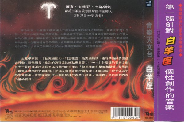 TCD-6101    确实、有行动、充满朝气 献给白羊及想了解白羊座的人 (3月21日--4月20日)   快节奏的打击乐和键盘所发出的超强动力, 深深敲击您的心灵。 全曲一气呵成,唤起白羊满身的活力和热情。   占星学家说:“他充满动力、斗志旺盛;他充满热情,随时准备好要出发去行动;对他而言,旅途的过程远比终点更重要”什么样的音乐才能火力十足的挥洒出这个充满行动力的白羊座?快节奏的打击乐和键盘,发展出一种无止尽的动力和行动;仿佛永无休止的主题旋律,不断向每一段充满活力的音乐推进。音乐家写出了一个什么样的白羊?听着,音乐里,是白羊们内在力量的根源。