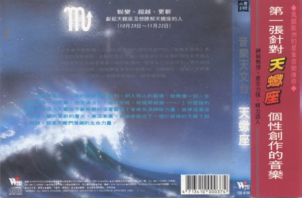 TCD-6108   蜕变、超越、更新 献给天蝎座及想了解天蝎座的人(10月23日--11月22日)   以音乐引领您一睹天蝎神秘的丰采。音乐风格的层次鲜活多变,峰回路转,有柳暗花明又一春的开阔心境。   占星学家说:“他的眼神坚定锐利,刺入别人的灵魂,他无惧一切,自信能克服一切打击,他充满活力,追根究底,蜕变再蜕变……”什么样的音乐才能深入天蝎座,不断蜕变的深层灵魂,音乐充满神秘力量,旋律逐渐深入发展、攀向更新的层次,渐深渐广,音乐家写出了一个什么样的天蝎?静心聆听,那是天蝎们潜藏的生命力量。