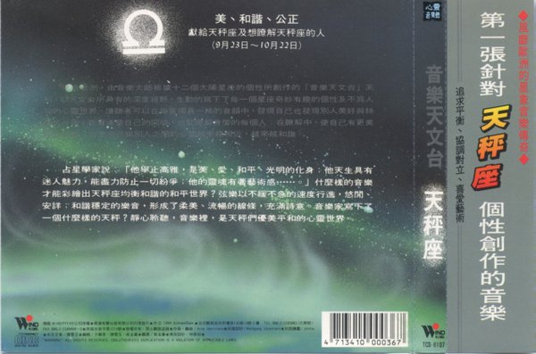 TCD-6107   美、和谐、公正 献给天秤座及想了解天秤座的人(9月23日--10月22日)   最优美柔和,一心追求平衡的天秤心灵。钟声敲开宽阔的天空,以和弦编织出简易的旋律,营造和谐流畅的乐音,清淡的基调中酝酿强著大的力度。   占星学家说:“他举止高雅,是美、爱、和平、光明的化身;他天生具有迷人的魅力,能尽力防止一切纷争;他的灵魂有着艺术感……”什么样的音乐才能彩绘出天秤座均衡和谐的和平世界?弦乐以不缓不急的速度行进,悠闲,安祥;和谐稳定的乐音,形成了柔美,流畅的线条,充满诗意。音乐家写了一个什么样的天秤?静心聆听,音乐里,是天秤们优美平和的心灵世界。