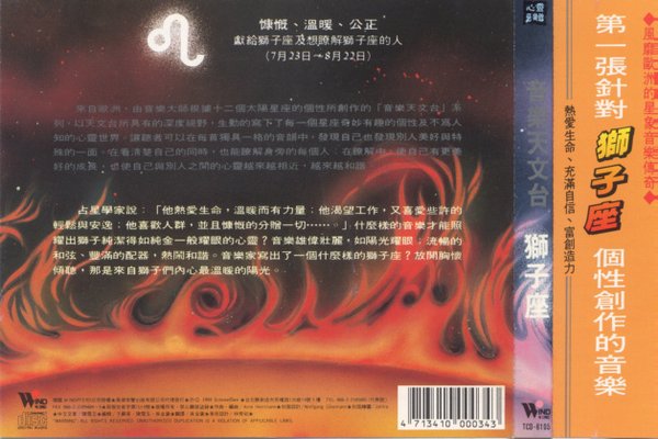 TCD-6105   慷慨、温暖、公正 献给狮子座及想了解狮子座的人(7月23日--8月22日)   探讨热爱生命、充满自信的百兽之王,鲜为人知的一面。雄伟的法国号和壮丽的弦乐声,如耀眼的阳光窜出地平线,不断跃升……一扫所有的阴霾。   占星学家说:“他热爱生命,温暖而力量,他渴望工作,又喜欢些许轻松与安逸;他喜欢人群,并且慷慨”赠予一切。什么样的音乐才能照耀出狮子纯得如金一般耀眼的心灵 ?音乐雄伟壮丽,如阳光耀眼;浏畅的和弦、丰满的配器,热闹和谐。音乐家写出了一个什么样的狮子座?放开胸怀倾听,那是来自狮子的内心最温暖的阳光。