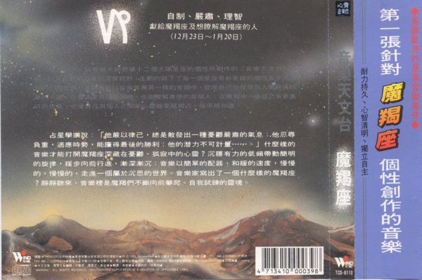 TCD-6110   自制、严肃、理智 献给魔羯座及想了解魔羯座的人(12月23日--1月20日)   认知一切事物的无常,魔羯将注意力集中在事情的精髓处,心思清明。以简单的配乐、和缓的速度,企图给人清楚单一的意象。   占星学家说:“ 他严以律己,总是散发出一种忧虑严肃的气息;他忍辱负重,适应时机,能获得最后的胜利;他的潜力不可计量……。”什么样的音乐才能打开魔羯座深藏在忧虑、孤寂中的心灵?沉稳有力的低频带动简明的旋律,缓步向前行进,渐深渐沉;音乐以简单的配器、和缓的速度,慢慢的,慢慢的,走进一个属于沉思的世界。音乐家写出了一个什么样的魔羯座?静静听来,音乐里是魔羯们不断向前攀爬、自我试练的灵魂。
