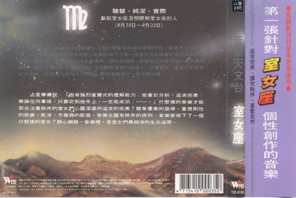 TCD-6106   聪慧、纯结、实际 献给室女座及想了解室女座的人(8月23日--9月22日)   规则的节奏,简单柔美的旋律,传达可爱保守的音乐风格,好比室女纤尘不染的心灵。是一张不可多得的绝美音乐,值得大力推荐。   占星学家说:“他有强烈直觉式的理解能力,他善于分析、追求完美,无论任何事情,只要交到他手上,一定能成功……”什么样的音乐才能契合秩序的室女们心灵深处追求的完美?简单优美的旋律,富规则性的节奏、干净、不复杂的配音,音乐主题有秩序的排列。音乐家写下了一个什么样的室女?静心细听,音乐里,是室女们纯净的生命追寻。
