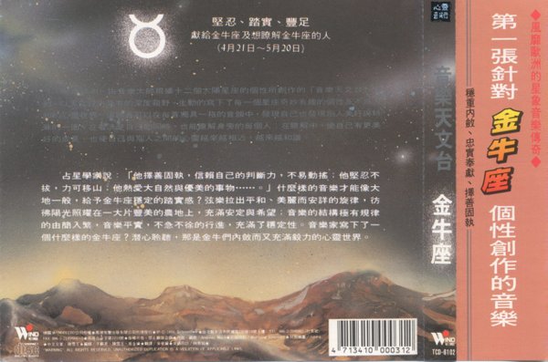 TCD-6102   坚忍、踏实、丰足 献给金牛座及想了解金牛座的人(4月21日--5月20日)   用音乐探讨稳重内敛,充满毅力的金牛心灵。 弦乐的平和安详,仿佛洒落满怀阳光,舒畅遍体。   占星学家说:“他择善固执,信赖自己的判断力,不易动摇;他坚韧不拔,力可移山;他热爱大自然与优美的事物。”什么样的音乐才能像大地一般,给予金牛座稳定的塌实感?弦乐拉出平和、美丽而安详的旋律,仿佛阳光照耀在一大片丽美的土地上,充满安定与希望;音乐的结构极有规律的由简入繁,音乐平实,不急不徐的行进,充满了稳定性。音乐家写下了一个什么样的金牛座?潜心聆听,那是金牛们内敛而又充满毅力的心灵世界。