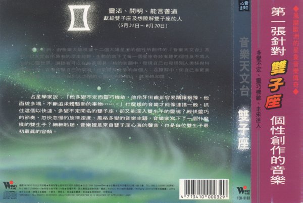 TCD-6103   灵活、开朗、能言善道 献给双子座及想了解双子座的人(5月21日-6月20日)   丰富跳跃的打击乐器,配上忽快忽慢的旋律,像极了风格多变的双子心灵,等待您的探索。发烧友票选为最有魅力的一张音乐。轻松灵巧的节奏,忽快忽慢的旋律速度、风格多变的音乐主题,细细聆听,音乐里是来自双子座心海的声音也是每位双生子最初最真的容颜。   占星学家说:“他多变不定,而赤巧机敏,他伶牙利齿却容易犹豫。他面貌多端,不断追求体验新的事物……”什么样的音乐才能像速描一般,抓住这个以快速、多变不定闻名的双子座,却又能深入双子的灵魂,轻松灵巧的节奏、忽快忽慢的旋律速度、风格多变的音乐主题、细细聆听,音乐时在是来自双子座心海的声音,也是每一位双子最初最真的容颜。