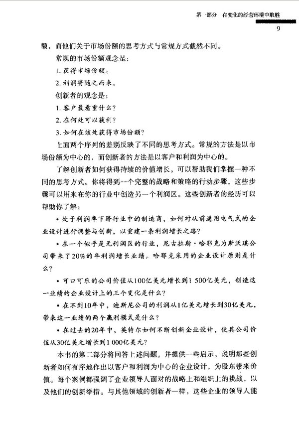 : 序言 前言 第一部分 在变化的经营环境中取胜 第一章 市场份额已经过时 第二章 以客户为中心的企业设计 第三章 利润如何产生 第二部分 创新者及其成功的案例 第四章 杰克·韦尔奇——为客户提供解决方案的企业设计 第五章 三个管理者的故事——平凡人物的企业 第六章 尼古拉斯·G·哈耶克——产品金字塔型的企业设计 第七章 罗伯特·郭思达——管理价值链企业设计 第八章 查尔斯·施瓦布——配电盘式企业设计 第九章 安迪·格鲁夫——领先两步的企业设计 第十章 迈克尔·艾斯纳——利润乘数型企业设计 第十一章 乔治·哈特索珀罗斯——分析型企业设计 第十二章 珀西·巴尼维克——全球专家网络型企业设计 第十三章 比尔·盖茨——创建行业标准的企业设计 第三部分 利润区手册 第十四章 利润区手册 第十五章 利润区手册 附录1 企业设计 附录2 企业设计与公司市场价值 附录3 在中国市场实现价值增长