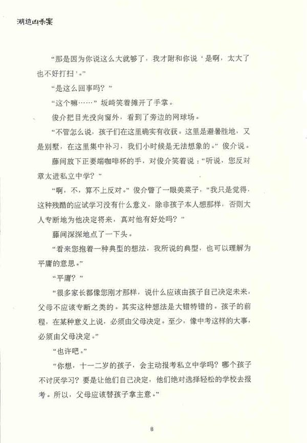 四对带着孩子到湖边参加升学集训的夫妇,还有一名尾随而至的年轻女子,深夜,女子惨遭杀害。她是谁?凶手又是谁?   妻子说:“是我杀的。”——丈夫的情人死在了湖边的别墅里。这是发生在有四个家庭参加的升中学考试集训中的事。他们为什么竭力掩盖凶手的犯罪真相?但是,事件的前后总难免会露出不自然的痕迹。真相到底如何?结局正向着难以预料的方向发展……