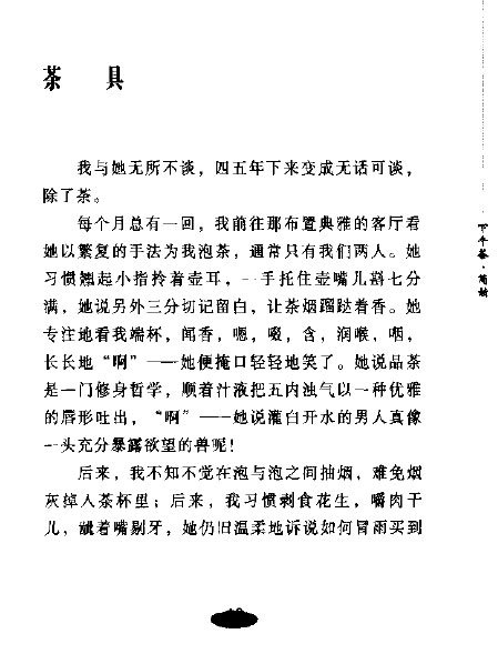 作者借茶来感悟人生。在我看过的这些作家里,她和李碧华是同属于把玩文字型的。读了她们的文字,你会发现再没有其她词汇可以更准确,深刻,一针见血地描述事物了。她们是文字工程的熟练工。一字让你冲入云霄,一字又让你坠入地域。