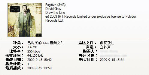 以获取更快的速度。 iTunes英国区2009.09.14发行;正版iTunes Plus AAC (256Kbps) 。 iTunes Plus AAC优于320Kbps的MP3,详细介绍请看iTunes Plus和AAC格式的说明