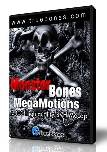 TrueBones - MonsterBones MegaMotions 动作库,CG动画师必备的动作素材。TrueBones 推出的三维动画素材资源:MonsterBones MegaMotions Library DVD内含超过2400个种类繁多的高品质、清晰连贯的动态捕捉(motion-capture)的BVH 文件。新的TrueBones 骨骼结构与转换性,为用户提供了有用的功能增强,包括提升了使用与操作的易用性。