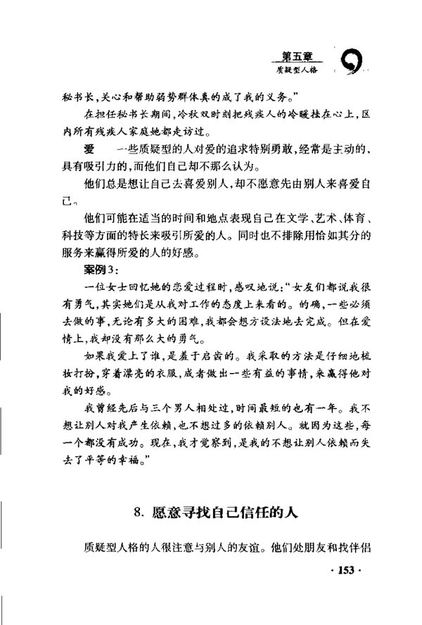 : 第一章 给予型人格 1.乐在助人 2.漠视自身的需要 3.骄傲是动力 4.赞美和迎合别人 5.遇压力时易怒 6.会为维护自己而战 7.释放艺术性的一面会充满活力 8.特权、野心和诱惑 9.受情绪和个人的难题所苦 10.给予型人格的人怎样完善自己 11.与给予型人格的人如何交往 第二章 实践型人格 1.头脑中尽是任务 2.具有竞争性 3.很在乎自己的形象 4.为认同角色而欺骗自己 5.虚荣根植在自我认知中 6.压力有时会促成一蹶不振 7.只要保持忙碌就不会碰触恐惧感 8.安全、地位和性 9.认为工作中的关系是一种手段 10.实践型人格的人怎样完善自己 11.与实践型人格的人如何交往 第三章 浪漫型人格 1.外向而活跃 2.把焦点放在关系和感觉上 3.潜在着被遗弃的感觉 4.羡慕别人 5.忧郁使自己苦乐参半 6.受到压力时会变成一个谄媚王 7.顺利时易产生完美主义倾向 8.胆大、羞愧和竞争 9.透过情绪表现感觉 10.陶醉在幻想世界里 11.浪漫型人格的人怎样完善自己 12.与浪漫型人格的人如何交往 第四章 观察型人格 1.容易染上资讯“毒瘾” 2.将生活加以区隔 3.生活形态只求最低 4.与感观、情绪保持距离 5.贪求能让自己感到安定和独立的一切 6.在心里搜寻可能会发生的事情 7.城堡、安全和包袱 8.与世界保持距离却渴望联系 9.观察型人格的人怎样完善自己 10.与观察型人格的人如何交往 第五章 质疑型人格 1.设想最坏的结果 2.觉得成功难以掌握 3.认定这个世界充满威胁 4.恐惧与反恐惧 5.和情绪更加保持距离 6.安定时会更加保持距离 7.热心、义务和爱 8.愿意寻找自己信任的人 9.感情生活中总爱怀疑 10质疑型人格的人怎么自我完善 11.与质疑型人格的人如何交往 第六章 享乐型人格 第七章 支配型人格 第八章 媒介型人格 第九章 完美型人格 第十章 检测自己人格类型的方法