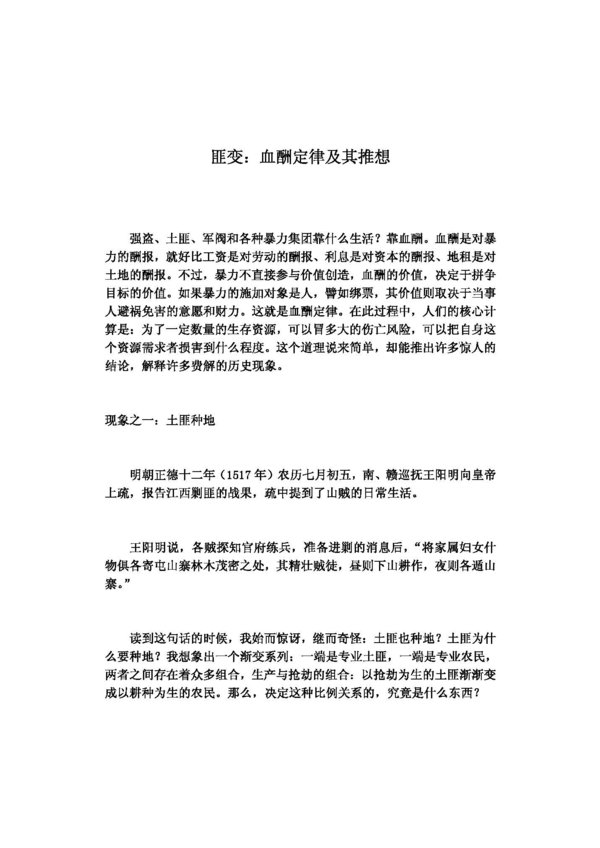 《血酬定律:中国历史中的生存游戏》提出了血酬和元规则等概述,这些概念代表了我力所能及的深度。所谓血酬,即流血拼命所得的酬报,体现着生命与生存资源的交换关系。从晚清到民国,吃这碗饭的人比产业工人多得多。血酬的价值,取决于所拼抢的东西,这就是“血酬定律”。这个道理很浅显,却可以推出许多惊人的结论。如果再引入一些因素,一层一层地推论下去,还可以解释书中的其他概念,成为贯穿全书的基本逻辑。因此,作者把“血酬定律”当作书名。