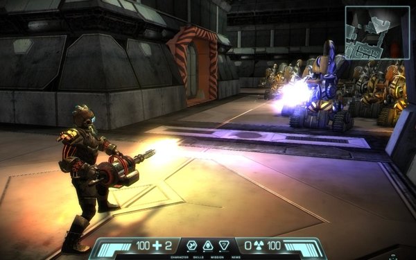 以星际旅行作为科幻故事背景,采用第三人称俯视可变视角的射击游戏,你的敌人是机器人和外星人,很多物品可以收集和升级技能,有点像Alien Shooter 或 Space Siege。