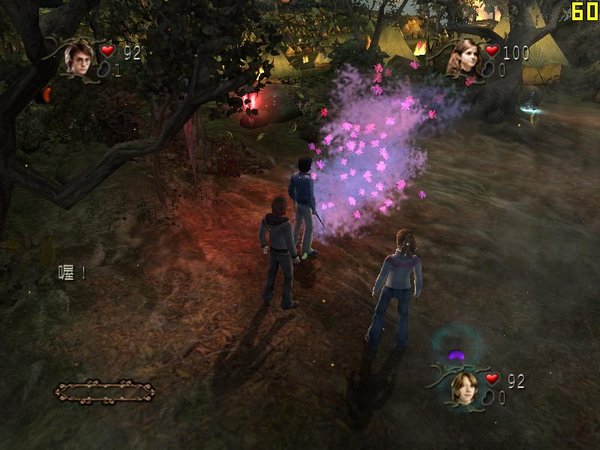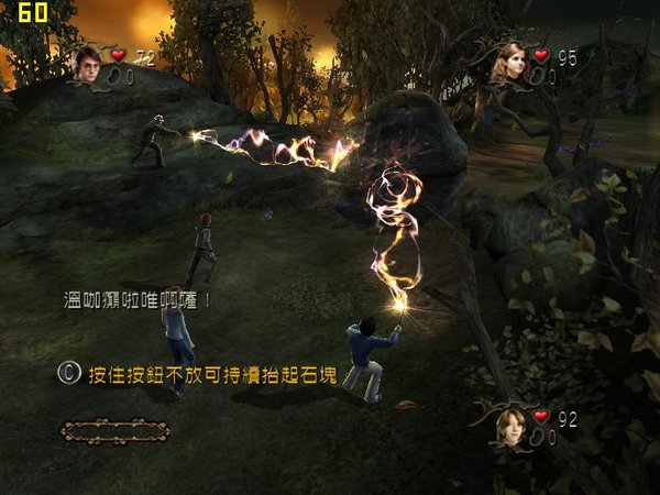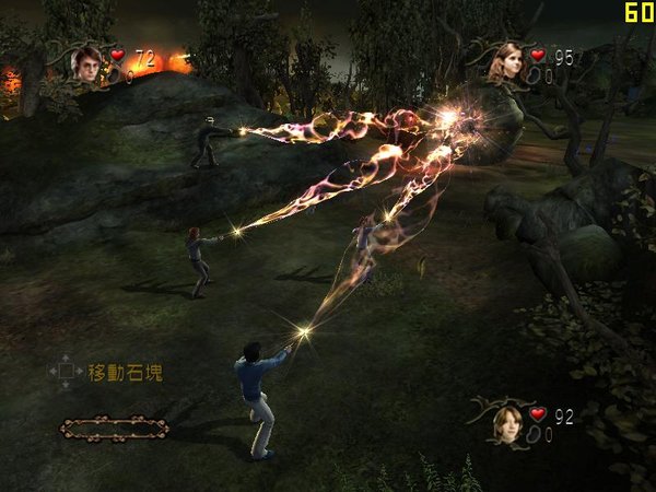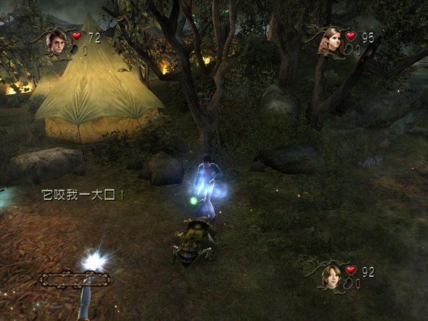 举个例子,在游戏开头的第一个场景——魁地奇世界锦标赛中,我们看到了各种各样的敌人,例如Death Eater、Lord Voldemort的花朵的魔法攻击,更不必提像狗一样凶恶的dugbog生物。在这个场景中,我们能使用的符咒是wingardium leviosa,那些《哈利波特》小说系列的拥趸知道这是能让使用者把物体浮起来的法术——在这种情况下,我们可以浮起巨大的石头来攻击敌人。同时,你也需要使用魔法来进行简单的解谜,例如你可以和其他两个角色(可以由其他玩家或者电脑控制)使用wingardium leviosa,移开巨大的石头来清除路障并继续前进。