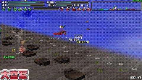 游戏名称:大空军 / 大空军Daikuugun 日文名称:大空军 Daikuugun 英文名称:Daikuugun(Dai Kuugun) 制作厂商:Global A Entertainment, Inc. 代理发行:Global A Entertainment, Inc. 游戏类型:STG - Shooting Game(空战射击游戏) 载体容量:UMD×1 对应主机:Play Station Portable(プレイステーション·ポータブル) 语言版本:日文(日版) 发卖日期:2009年12月10日(木曜日/星期四) 参考价格:5,040日元 官方网站: http://www.daikuugun.com/ ━━━━━━━━━━━━━━━━━━━━━━ 游戏简介: 日本游戏发行商GAE公司制作发行。预定2009年冬季发售,由PSP掌机独占。以二次世界大战为题材的STG空战射击新作:《大空军》(Daikuugun)。目前官方放出部分游戏画面,供各位玩家参考。 由PSP掌机独占的射击新作:《大空军》(Daikuugun)是一款能让玩家驾驶美日等世界各国战机来完成任务的飞行射击游戏。游戏最大特色在于以横向视点的2D射击游戏玩法来实现360度任意方向旋转的乐趣,同时加入3D飞行射击要素,让玩家体验历史上以为主题的虚拟作战,挑战各种任务。 另外,本作也支持玩家以Windows专用工具来自由创作任务,并将制作完成的任务上传到PSP记忆卡中保存,再由玩家自行挑战。目前GAE官网也将提供该工具让玩家下载或接受玩家自创任务的投稿,未来也将把这些创作上线开放玩家下载。 由PSP掌机独占的空战射击新作:《大空军》(Daikuugun)目前预定2009年12月10日发售。游戏售价为5,040日元(含税价)。新作将会收录多种迷你挑战任务,并且支持PSP的Ad Hoc无线网络模式,可支持2至4名玩家联机合作游戏。对于有喜欢射击类游戏的新老玩家们不可错过这款本作。