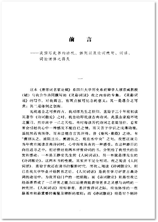 本书为作者与前辈学人缪钺合作共同撰写《灵谿词说》之个人部分内容专集。在作者所有文集中,本书有其特殊意义,此意义一言以蔽之,乃文章体例之别致:全书每篇文论,首先以个人读词之心得为主,分别写为韵文形式的论词绝句,内容包括对词体特质之介绍,对词人之论评,对某篇词作之赏析,等等,先以绝句综括所欲议论之要旨,然后再以散文展开做详细说明。