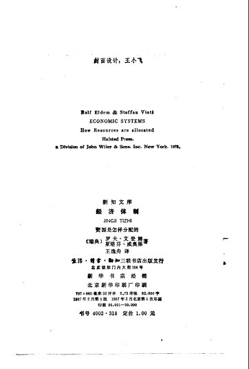 : 中译者的话 作者前言 序言 一.导论 二.资源分配的两种理论模式 三.现实生活中的经济体制 四.处在更广阔背景中的经济体制 五.评价和比较经济体制 补充参考书目 重要术语汇编 知识中国的好友邀请链接 知识中国电驴乐园个人主页