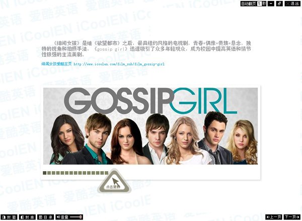 爱酷英语,提供影视中英对照剧本及词汇解析,在中英对照剧本的基础上,添加每句对白的人物名称,修正对白错误和问题,以四级词汇为准挑出疑难词汇后,根据国内外词典给出词汇在剧本中的语境意思,让用户能够很轻松的理解剧情,达成娱乐中学习英语的最佳效果。