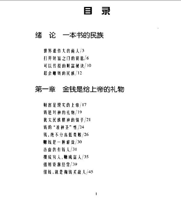 : 绪论 一本书的民族 世界最伟大的商人 打开财富之门的钥匙 可以传授的财富秘诀 最会赚钱的民族 第一章 金钱是给上帝的礼物 财富是现实的上帝 钱是对神的礼物 犹太民族精神的镜子 钱的“准神圣”性 钱,绝不分高低贵贱 赚钱是一种游戏 吝啬的有钱人 攒成穷人,赚成富人 借用资源经营 借钱,就是换钱买敌人 第二章 财富的契约 与上帝签订契约的民族 信守契约的生命线 诚实的支柱 信任的价值 规则的魅力 钻透法律的金洞 让年轻人先发言 希望与信心 堂堂正正的精明 生意场上没有禁忌 第三章 在博弈中创业 拥有富人的气息 赚钱靠真智慧 永远的财富是智慧 智慧比知识更重要 商人也要学识渊博 做个杂学博士 干活越少,赚钱越多 怀疑一切 走向外面世界的钥匙 犹太智慧的沃土 第四章 逆风飞扬 第五章 财富的品质 第六章 思考致富