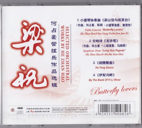 此处介绍中央乐团交响乐队演奏的一组何占豪先生创作的管弦乐作品。该碟1986年由中国内地与香港宝丽金公司联合录制,是中国内地第一张CD唱片,在荷兰刻模印制,收录有小提琴协奏曲《梁祝》、交响诗《龙华塔》、民族管弦乐《胡腾舞曲》、《伊犁河畔》等四首乐曲。由于是中国第一张CD唱片,因此制作方高度重视,特请中央乐团协奏,由资深指挥家韩中杰执棒,《梁祝》作者何占豪先生亲自监制。该唱片获得了首届中国金唱片奖。