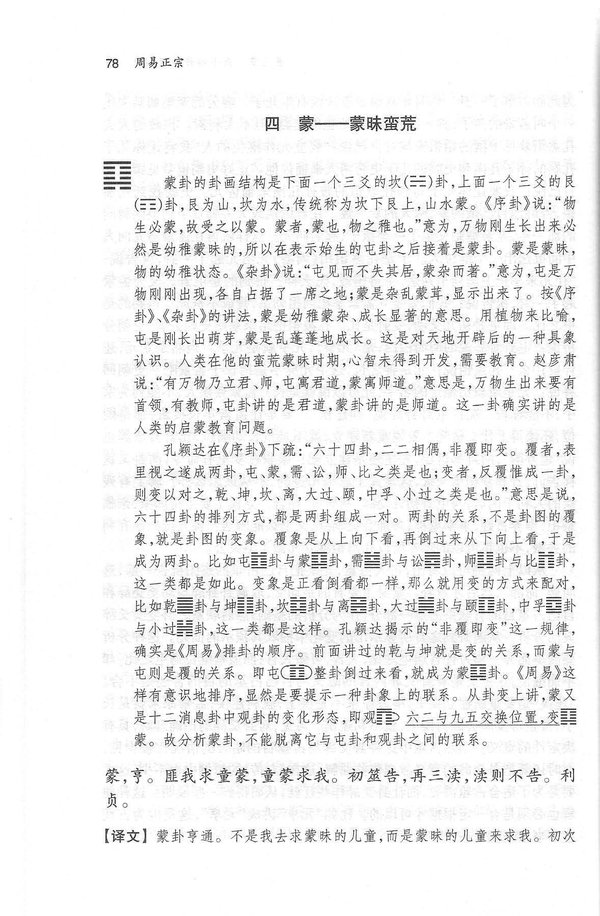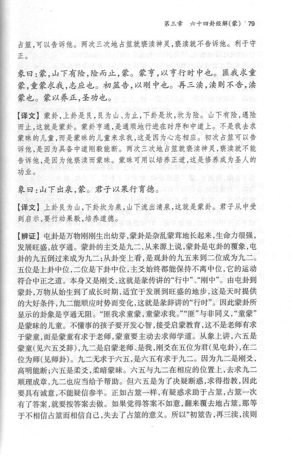 第三章是全书的主体,分别讲解六十四卦。其基本体例是:各卦第一段说明卦画,并依《序卦》《杂卦》为据解释卦名,正名知本。第二段解释卦辞,彖传、大象。先对原经、原传作简单译述,紧附于原文之后。