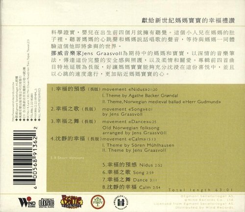 : 献给新世纪妈妈宝宝的幸福礼赞 我在等待 等待一种只属于我们的满足 你现在已经拥有我所有的关爱 但是我将给你更多 我知道为了你 我会有比现在多上好几倍的爱 我要我们成为彼此幸福的泉源 你来的时候 就是幸福来的时候 科学证实,婴儿在出生前四个月就拥有听觉。这个小人儿在妈妈的肚子里,听著妈妈的心跳声,和妈妈说话唱歌的声音,等待与妈妈一同体验这个他即将参与的世界。 挪威音乐家Jens Graasvoll为期待中的妈妈和宝宝,以深情的音乐笔法,传达这份完整的安全感与照护,以及柔情和关爱。专辑前四首曲目特地延展为长版,好让妈妈宝宝能够充分沉浸在这份喜悦中,并且以心跳的速度进行,更加贴近妈妈宝宝的心。 北欧知名教育机构及助产士协会联名推荐 http://www.tudou.com/v/-cutHN8eTX0