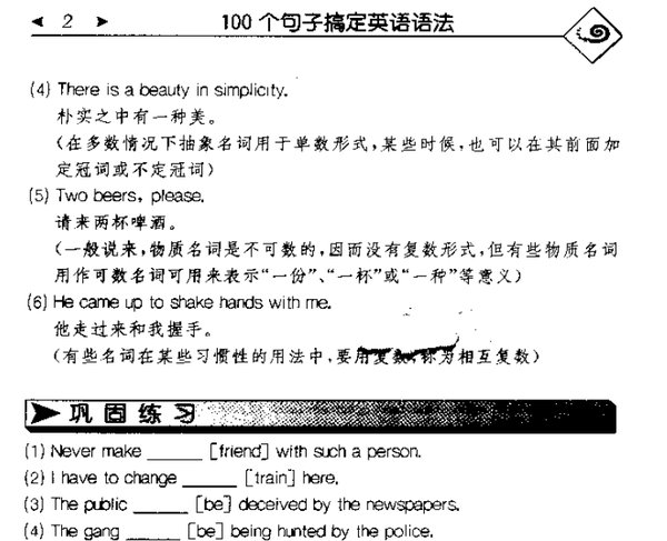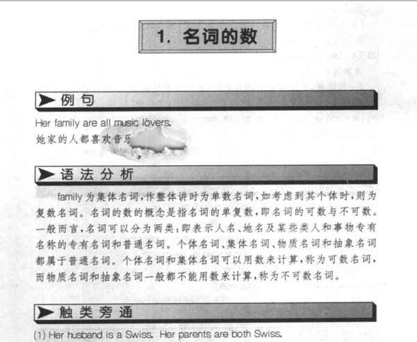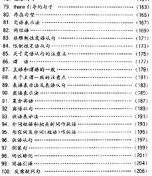 : 1. 名词的数 2. 关于名词的数的注意点 3. 名词所有格 4. 冠词的基本用法 5. 冠词在各类名词前的用法 6. 关于冠词用法的注意点 7. 人称代词和物主代词 8. 关于物主代词的注意点 9. it的用法 10. 自身代词和相互代词 11. 疑问代词和连接代词 12. 关系代词 13. 不定代词 14. some的用法 15. all的用法 16. other, another的用法 17. 数词 18. 关于数词的注意点 19. 量词 20. 动词的种类 21. 一般现在时 22. 一般现在时的特殊用法 23. 一般过去时 24. 过去进行时 25. 现在进行时 26. 一般将来时 27. 现在完成时 28. 过去完成时 29. 关于完成时态的注意点 30. 关于动词时态的注意点 31. 被动语态 32. 各个时态的被动语态 33. 各种结构的被动形式 34. 非谓语动词的被动形式 35. 应用被动结构的情况 36. 关于被动语态的注意点 37. 虚拟语气 38. 虚拟语气在条件句中的用法 39. 虚拟语气在某些从句中的用法 40. must的用法 41. can (could)的用法 42. may (might)的用法 43. need的用法 44. dare的用法 45. have的用法 46. do的用法 47. will (would)的用法 48. should的用法 49. ought的用法 50. 情态动词的其他用法 51. 不定式的用法 52. 关于不定式用法的注意点 53. 动名词的用法 54. 关于动名词用法的注意点 55. 现在分词的用法 56. 过去分词的用法 57. 延续性动词与非延续性动词 58. 动词句型:主语+不及物动词 59. 动词句型:主语+及物动词+宾语 60. 动词句型:主语+双宾动词+间接宾语+直接宾语 61. 动词句型:主语+系动词+表语 62. 动词句型:主语+及物动词+复合宾语 63. 形容词的类型 64. 名词化的形容词 65. 形容词的位置 66. 形容词的比较级别 67. 形容词比较级别的注意点 68. 副词的类型 69. 副词在句中的作用 70. 副词的比较级别 71. 副词的位置 72. 关于副词的若干注意点 73. 介词 74. 关于of...to do sth.和for...to do sth. 75. 含进行意义的介词和含动词意义的介词 76. 连词 77. 主语表示法及it作主语的句子 78. 主语从句 79. there引导的句子 80.存在句型 81.定语表示法 82.同位语 83.非限制性定语从句 ……(82-99看上面截图) 100.反义疑问句
