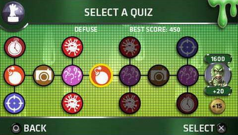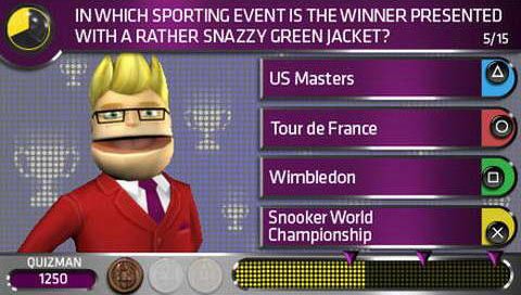 而在PSP版《喧闹少年找碴大师4:测验世界》的单人游戏模式中,可以通过挑战而获得奖章、奖杯等。在连续正确的回答问题、使用更短的时间回答问题都能够获得奖章奖励。游戏中出现的人文相关的问题仍是以英文为主,毕竟只是面向欧洲地区使用英语的玩家,国内的玩家想充分体验这款游戏的魅力,还是需要一定的英语功底的。游戏的PSP版目前预定2009年12月底在英国发售,想考验自己知识面的玩家不可错过这款游戏。