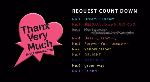 : CD1 01. Close To Your Heart 02. It's crazy for you 03. Ohh! Paradise Taste!! 04. 恋はスリル、ショック、サスペンス 05. FAITH 06. Run up 07. NAVY BLUE 08. Forever You~永遠に君と~ 09. I can't stop my love for you 10. Sincerely Yours 11. Can you feel the POWER OF WORDS ? -DJ ME-YA'S ESSENCE OF WORDS- 12. Deep Freeze CD2 01. 風のない海で抱きしめて 02. FULL JUMP 03. Over Shine 04. 空気 05. Dream×Dream 06. START 07. Boom-Boom-Boom 08. 赤く熱い鼓動 09. ORANGE★NIGHT 10. GLORIOUS 11. PRECIOUS PLACE 12. MIRACLE CD3 01. 薔薇が咲く 薔薇が散る 02. Mint 03. 眠れぬ夜に 04. PARTY TIME PARTY UP 05. I believe you~愛の花~ 06. 君との出逢い~good bye my days~ 07. Friend 08. 素顔のまま 09. アイノコトバ 10. STORY 11. SUMMER LIGHT 12. MAGIC DVD 01. Dream × Dream 02. 恋はスリル、ショック、サスペンス 03. Her Lament ~誰にも聞こえない彼女の叫び~ 04. Dear…。From…。 05. Forever You ~永遠に君と~ 06. yellow carpet 07. DELIGHT 08. NAVY BLUE 09. green way 10. Friend