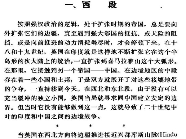 《印度对华战争》作者:[澳大利亚] 内维尔·马克斯韦尔 中印边界争端是二十世纪中叶国际关系史上富于戏剧性的一段。世界上两个人口最多的国家也是亚洲的两个伟大的新共和国,尽管政治性质不同,似乎已经走上和睦合作的道路,但后来却为了几块荒凉的、艰险的、没有什么价值的土地争吵起来,还打了一场短促而剧烈的边境战争。印度在世界事务中的作用由此一落千丈。同中国友好曾经是贾瓦哈拉尔·尼赫鲁制定的印度外交政策的基石:印度奉行不结盟政策,当世界各国是如此清楚地划分成两个集团的时候,印度拒绝把它的命运同任何一个集团——共产党的或反共产党的——联系在一起;在国防上依靠自己,在外交政策上独立自主;冒着武装部队受到削弱的风险,集中力量发展经济——这一切都取决于同中国的友好和有一条和平的北部边界。同中国发生冲突,北部边界上形势紧张,就需要支出巨额军费,这样就会使支撑尼赫鲁的各项政策的拱门整个垮下来。尼赫鲁的统治地位也会随之告终。