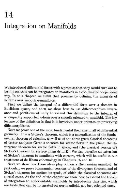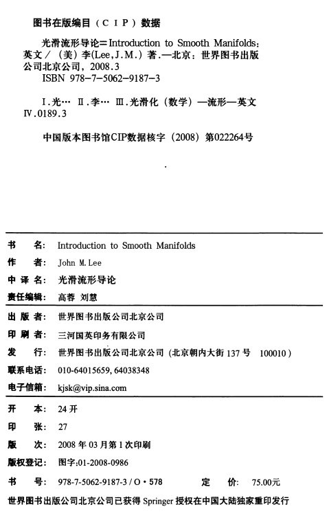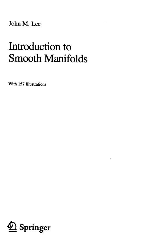 目次: 光滑流形; 光滑映射; 切向量; 向量场; 向量丛; 余切丛; 浸入,嵌入;子流形;李群行为;近似理论;张量;微分形式;定向;流形上的积分;De Rham 同调;de Rham定理;积分曲线与流;积分流形;李群和李代数。