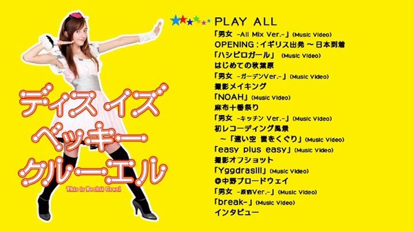 在NICO试跳区掀起英伦风潮的14岁少女Beckii Cruel前些日子在秋叶原举办了出道演出,让无数宅男甘心拜于大小姐石榴裙之下。 12月9日,Beckii的首张DVD发售,收录了她的多段舞蹈影像,成名作《男女》录制了多个版本,在DVD中Beckii展示了自己活力四射的舞者形象,在起居室,厨房、卧室等不同地点身穿不同的服装进行舞蹈表演。 DVD中还收录了10月Beckii第一次来日本举行舞台演出的影像,她在日本的行程被记录下来,还有初次试穿和服的影像哦,金发美少女配上和服并不是动画中专属的哦~虎之穴秋叶原B店设置了专门柜台进行DVD贩售,现场播放PV,很是火热,销量很不错。秋叶原地区限定特典是B2尺寸的大海报。 按: 这支DVD非常难见,网上没有多少详细信息。能够发布,要感谢一位台湾的朋友,这张镜像应该就是他抓取的。感谢他的劳动能够让大家分享到Beckii完整的可爱活泼舞姿。 我不喜欢Rip,硬盘都的片子都是这类DVD镜像。所以要求小体积的同学,只能抱歉啦:-) 好在现在傻瓜化的rip工具很多。图片均为实际播放截图