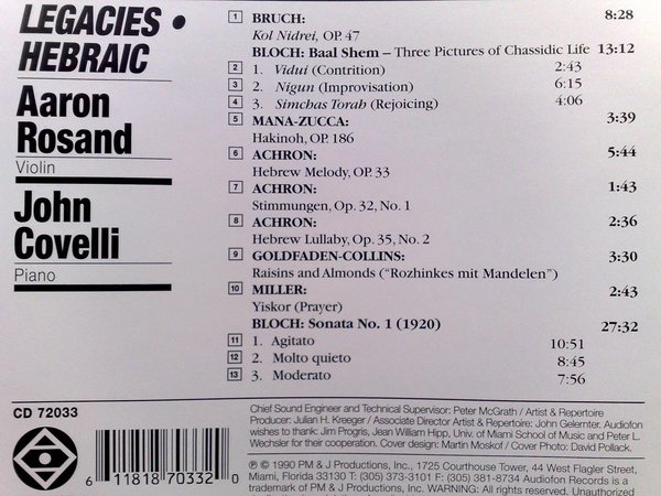 名列古典音乐权威杂誌「留声机」评选的二十世纪三十六位传奇小提琴名家榜之一的亚伦‧罗桑(Aaron Rosand),1927 年出生於美国印第安纳州,师承小提琴巨匠易沙意与奥尔,他的演奏技巧无懈可击,琴音高贵典雅,深受乐迷喜爱。亚伦‧罗桑以优美的琴音和洗练的技巧,搭配约翰‧柯凡力(John Covelli)的精彩钢琴演出,所演出的这张以犹太音乐为主轴的「希伯来遗产」早就是音响迷人手一张的标準小提琴与钢琴测试片。