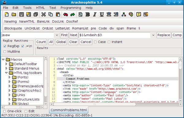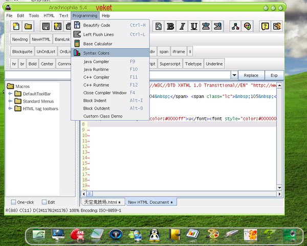 Arachnophilia 一个全功能的HTML创作工具,纯Java写成,可从任何Windows 95兼容的应用程序中导入全格式化文本、表格、草图,自动转换到HTML。支持最多六个Web浏览器,你可以在它们之间随意切换。支持 HTML,frames,CGI,Perl,C++,Java和JavaScript开发。内置FTP客户程序能自动上载修改过的文件。强大的键盘宏。用户定义工具条。用户定义文件模板,允许你指定默认的文档格式和内容。内置按部就班的HTML开发、JavaScript、frames、以及 Internet向导。 对于大多人来说,在目前商业版本的网页编辑软体中可能会有相当多的功能您都用不到,而视觉化的网页编辑方式对于部分的网页工程师来说并不是那么样的顺手,如果您早已习于文字形式的编辑的话,Arachnophilia相信应该可符合您的需求。 虽然Arachnophilia是一个免费的网页编辑软体,但并不会因为他是免费的,就在功能上就会打折扣,相对的,他还拥有许多不错的功能喔!!!