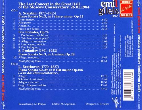 : Vol. 4 Recital that took place at the Great Hall of the Moscow Conservatory on 26.01.1984 Tracklist: Cd 1 01. Scriabin, Sonata No.3 in F sharp minor, Op.23 - 1. Drammatico [0:06:50.34] 02. Scriabin, Sonata No.3 in F sharp minor, Op.23 - 2. Allegretto [0:02:50.67] 03. Scriabin, Sonata No.3 in F sharp minor, Op.23 - 3. Andante [0:05:11.26] 04. Scriabin, Sonata No.3 in F sharp minor, Op.23 - 4. Presto con fuoco [0:06:22.74] 05. Scriabin, Five Preludes, Op.74 no.1 [0:01:16.23] 06. Scriabin, Five Preludes, Op.74 no.2 [0:01:32.34] 07. Scriabin, Five Preludes, Op.74 no.3 [0:01:04.73] 08. Scriabin, Five Preludes, Op.74 no.4 [0:01:19.43] 09. Scriabin, Five Preludes, Op.74 no.5 [0:01:33.38] 10. Prokofiev, Sonata No.3 in A minor, Op.28 - Allegro tempesto [0:08:49.45] Cd 2 01. Beethoven, Sonata No.29 in B flat major, Op.106 - 1. Allegro [0:12:18.25] 02. Beethoven, Sonata No.29 in B flat major, Op.106 - 2. Scherzo. Assai vivace [0:02:49.32] 03. Beethoven, Sonata No.29 in B flat major, Op.106 - 3. Adagio sostenuto [0:18:52.01] 04. Beethoven, Sonata No.29 in B flat major, Op.106 - 4. Largo. Allegro risoluto [0:13:49.21]
