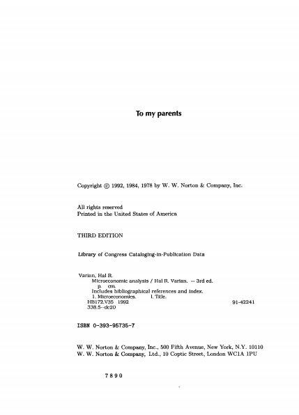 Classic features: * Emphasis on the dual approach to consumer and firm behavior. * Integration of the modem analytic approach with classical price theory * Analysis of economic behavior using classical methods of comparative statics, duality, and nonparametric methods. * Emphasis on analytical techniques that are useful in applied research. Highlights of the revision: * New chapter on game theory that provides an appropriate introduction for first-year students. * New chapter on oligopoly that features many of the recent developments in this area. * New chapter on asset markets that describes "what every economist should know" about the theory of financial markets. * New chapter on information economics that provides a unified treatment of incentives and markets in the presence of information asymmetries.