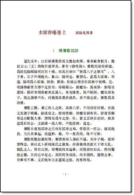 这本书虽曾连续排印过两次,但流传甚少,现在重印,书名取它第一次的署名,仍名《水窗春囈》,只将两位作者的名字添进去。至於内容,除增补两条外,未加删节。凡第一种本上明显的错字,根据第二种本校正,错字用小号字保留在( )内,校正之字排在〔 〕内。还有一些颠倒错乱的地方,如把“文节”误为“忠节”,把“恪慎”误为“慎恪”等等,无论是作者记忆不真,或排印时弄错,我们经过考证,也把它校正过来,如有不当之处,希望读者指教。