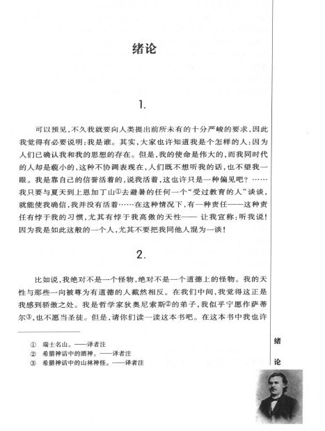 : 名家论尼采 绪论 我为什么这样有智慧 我为什么这样聪明 我为什么能写出这样优秀的书 《悲剧的诞生》 《不合时宜的考察》 《人性的,太人性的》及其两个绪篇 《朝霞》——论道德即是偏见 《快乐的科学》 《查拉图斯特拉如是说》——一本为所有的人、也不为任何人写的书 《善恶的彼岸》——未来哲学的序曲 《道德的谱系》——一篇论战的文章 《偶像的黄昏》——怎样用锤子探讨哲学 《瓦格纳事件》——一个音乐家的问题 为什么我是命运 附录1:茨威格笔下的尼采 附录2:尼采与希特勒 附录3:尼采的简历 附录4:尼采主要著作