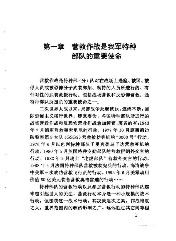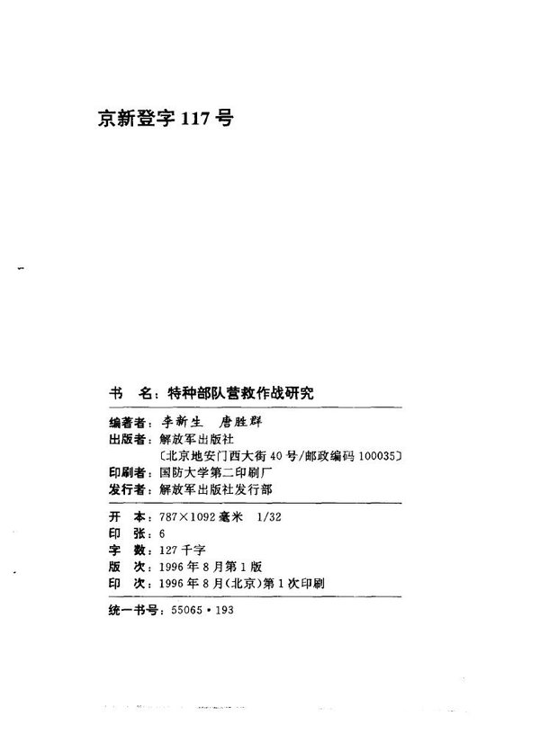 战场营救作战、反恐怖营救作战是自二次世界大战以来最为引人注目的小规模军事行动,其风险之强、实施难度之大、决策层次之高、影响范围之广,使得营救行动以及实施营救行动的特种部队名扬四海。作者在大量搜集、研究、整理中外营救作战战例的基础上,结合战例的历史背景以及特种部队的性质、任务、编制装备、作战能力、地位作用等,对营救作战的产生、发展、决策、实施及其影响诸方面,不仅军事角度,更从政治、经济、外交、科技以及社会发展等不同侧面进行了较深入、系统地探讨和研究。 私人认为第七章战例还是蛮好看的 出版信息页: