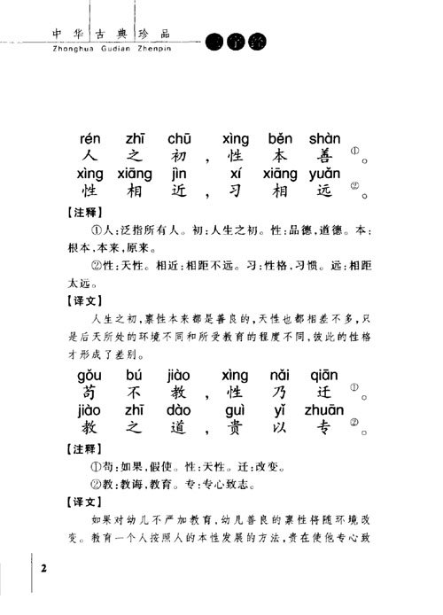 《三字经》是中国古代历史文化的宝贵遗产,是学习中华传统文化不可多得的儿童启蒙读物。它短小精悍、琅琅上口,千百年来,家喻户晓。其内容涵盖了历史、天文、地理、道德以及一些民间传说,所以说熟读《三字经》可知天下事。基于历史原因,《三字经》不可避免的含有糟粕,但其独特的思想价值和文化魅力为人们所公认,被历代人们奉为经典而不断流传。根据《三字经》衍生出了一些其他读物,还有同名京剧。   《百家姓》是一本关于中文姓氏的书,成书于北宋初。原收集姓氏411个,后增补到504个,其中单姓444个,复姓60个。 《百家姓》的次序不是依各姓氏人口实际排列,而是因为读来顺口,易学好记。《百家姓》与《三字经》、《千字文》并称“三百千”,是中国古代幼儿的启蒙读物。   《千字文》根据史书记载,是南朝梁武帝在位时期(502 —549 年)编成的,其编者是梁朝散骑侍郎、给事中周兴嗣。据唐代李倬《尚书故实》记载梁武帝命大臣殷铁石模次王羲之书碣碑石的字迹,又要求拓出一千字都不重复,以赐八王。殷铁石拓出后,此千余字互不联属,粱武帝又命令周兴嗣将这一千字编成有意义的句子,“卿有才思,为我韵之。”。结果周兴嗣竟写成了《千字文》,头发都白了。古人多简称其为《千文》。   《弟子规》原名《训蒙文》,原作者李毓秀(公元1662年至1722年)是清朝康熙年间的秀才。以「论语」「学而篇」弟子入则孝,出则悌,谨而信,泛爱众,而亲仁,余力学文为中心。分为五个部分,具体列述弟子在家、出外、待人、接物与学习上应该恪守的守则规范。后来清朝贾存仁修订改编《训蒙文》,并改名《弟子规》,是启蒙养正,教育子弟敦伦尽份防邪存诚,养成忠厚家风的最佳读物。 出版信息页: