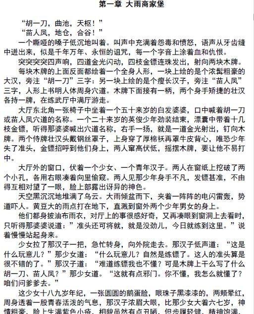 : 上 第一章 大雨商家堡 第二章 宝刀和柔情 第三章 英雄年少 第四章 铁厅烈火 第五章 血印石 第六章 紫衣女郎 第七章 风雨深宵古庙 第八章 江湖风波恶 第九章 毒手药王 第十章 七心海棠 下 第十一章 恩仇之际 第十二章 古怪的盗党 第十三章 北京众武官 第十四章 紫罗衫动红烛移 第十五章 华拳四十八 第十六章 龙潭虎穴 第十七章 天下掌门人大会 第十八章 宝刀银针 第十九章 相见欢 第二十章 恨无常 后记