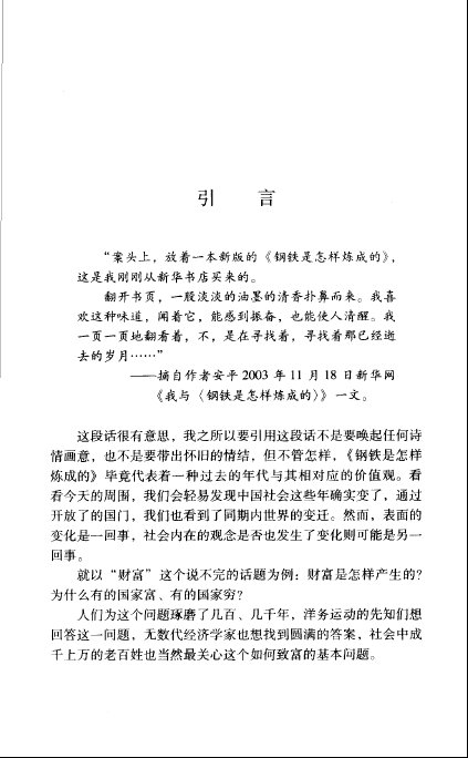 : 自序……………………………………………………………(1) 引言……………………………………………………………(1) 第一部分财富是怎样产生的 第一章财富是怎样产生的…………………………………(11) 第二章过时的“地大物博”财富观………………………(33) 第三章什么妨碍我们创业…………………………………(45) 第四章“新重农主义”大可不必…………………………(54) 第五章美国基金公司为何比银行创造更多富豪…………(64) 第六章证券市场发展与共同富裕…………………………(76) 第七章也谈“中国特色”…………………………………(86) 第八章民营企业受让国有股:究竟谁获益………………(89) 第二部分中国经济与世界 第九章太平洋贸易能否带来长久繁荣…………………(103) 第十章从世界变迁谈中国的崛起………………………(117) 第十一章全球化下的中国选择:“单极”还是 “多极”秩序……………………………………(136) 第十二章“武打”.法治与经济秩序……………………(151) 第三部分证券市场与制度 第十三章金融创新的社会与制度环境…………………(167) 第十四章金融业不能民营化……………………………(172) 第十五章证券市场监管的艰难…………………………(180) 第十六章寻租与政策市场………………………………(185) 第十七章如何评价股市的贡献…………………………(190) 第十八章谁来监督“监管委员会”……………………(196) 第十九章应尽快变卖国有资产,并让人大常委会 做监督………………………………………(200) 第四部分上市公司与股票市场 第二十章到哪里去上市…………………………………(207) 第二十一章为管理层股票期权正名……………………(215) 第二十二章安然之谜……………………………………(226) 第二十三章股市泡沫逼人铤而走险 ——解读美国股市当前的危机……………(244) 第二十四章泡沫破灭引发经济衰退——重温1929年美国 股灾…………………………………………(257) 第二十五章中国会计师的困境…………………………(268)
