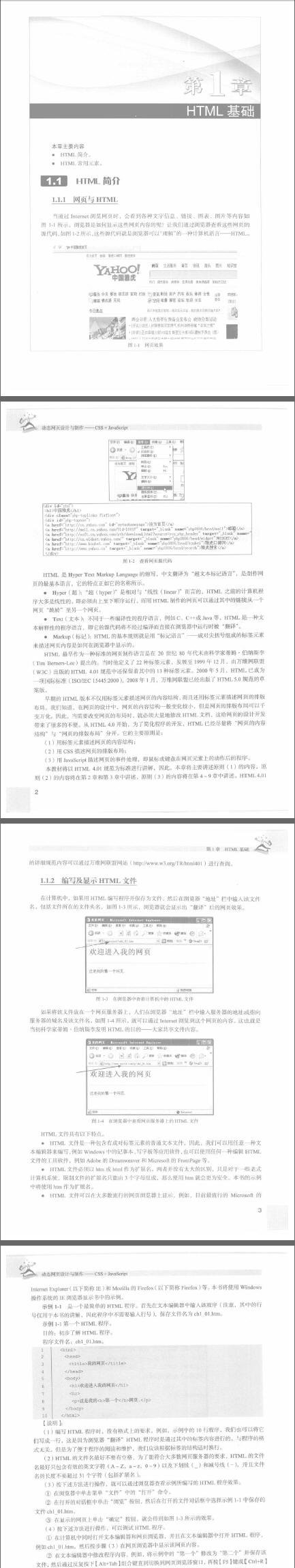 : 第1章 HTML基础 1.1 HTML简介 1.2 HTML常用元素 习题一 第2章 CSS基础 2.1 CSS简介 2.2 CSS的基本语法 习题二 第3章 CSS实用技巧 3.1 CSS的常用技巧 3.2 CSS用于网页布局设计 3.3 CSS用于菜单设计 3.4 CSS其他设计原则 第4章 JavaScript简介 4.1 什么是JavaScript 4.2 编辑与调试JavaScript 4.3 第一个JavaScript示例 习题四 第5章 JavaScript编程基础 5.1 数据类型及变量 5.2 表达式与运算符 5.3 基本语句 5.4 函数 5.5 对象 5.6 事件及事件处理程序 习题五 第6章 JavaScript常用内置对象 6.1 数组(Array)对象 6.2 字串(String)对象 6.3 数学(Math)对象 6.4 日期(Date)对象 习题六 第7章 JavaScript常用文档对象 7.1 文档对象结构 7.2 文档对象 7.3 动态改变网页内容和样式 习题七 第8章 JavaScript其他常用窗口对象 8.1 屏幕(screen)对象 8.2 浏览器信息(navigator)对象 8.3 窗口(window)对象 8.4 网址(location)对象 8.5 历史记录(history)对象 8.6 框架(frame)对象 习题八 第9章 JavaScript实用技巧 9.1 建立函数库 9.2 识别浏览器的方法 9.3 校验用户输入 9.4 弹出窗口 9.5 下拉菜单 9.6 事件冒泡处理 9.7 动画技术 习题九 第10章 实训项目 10.1 "第1章 HTML基础"实训 10.2 "第2章 CSS基础"实训 10.3 "第3章 CSS使用技巧"实训 10.4 "第4章 JavaScript简介"实训 10.5 "第5章 JavaScript编程基础"实训 10.6 "第6章 JavaScript常用内置对象"实训 10.7 "第7章 JavaScript常用文档对象"实训 10.8 "第8章 JavaScript其他常用窗口对象"实训 10.9 "第9章 JavaScript实用技巧"实训