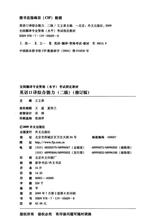 中文名: 人事部翻译考试指定教材--2009版英语口译综合能力+实务2级(文本及听力)(全国翻译专业资格水平考试辅导丛书)